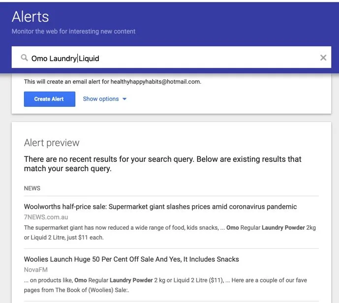 Make a little list of everything you buy at the grocery, department store or pharmacy that you buy on an adhoc basis that is roughly $15.00 or over. Then, pop the name of these brands and the item into a Google Alert. You’ll then get an email notification each time the product you’ve saved is on special/half price etc. Make note of this and then visit that store and stock up, maybe get 2-3 packets to last for a while. Amazing. Have a look at the screenshot here for an example.