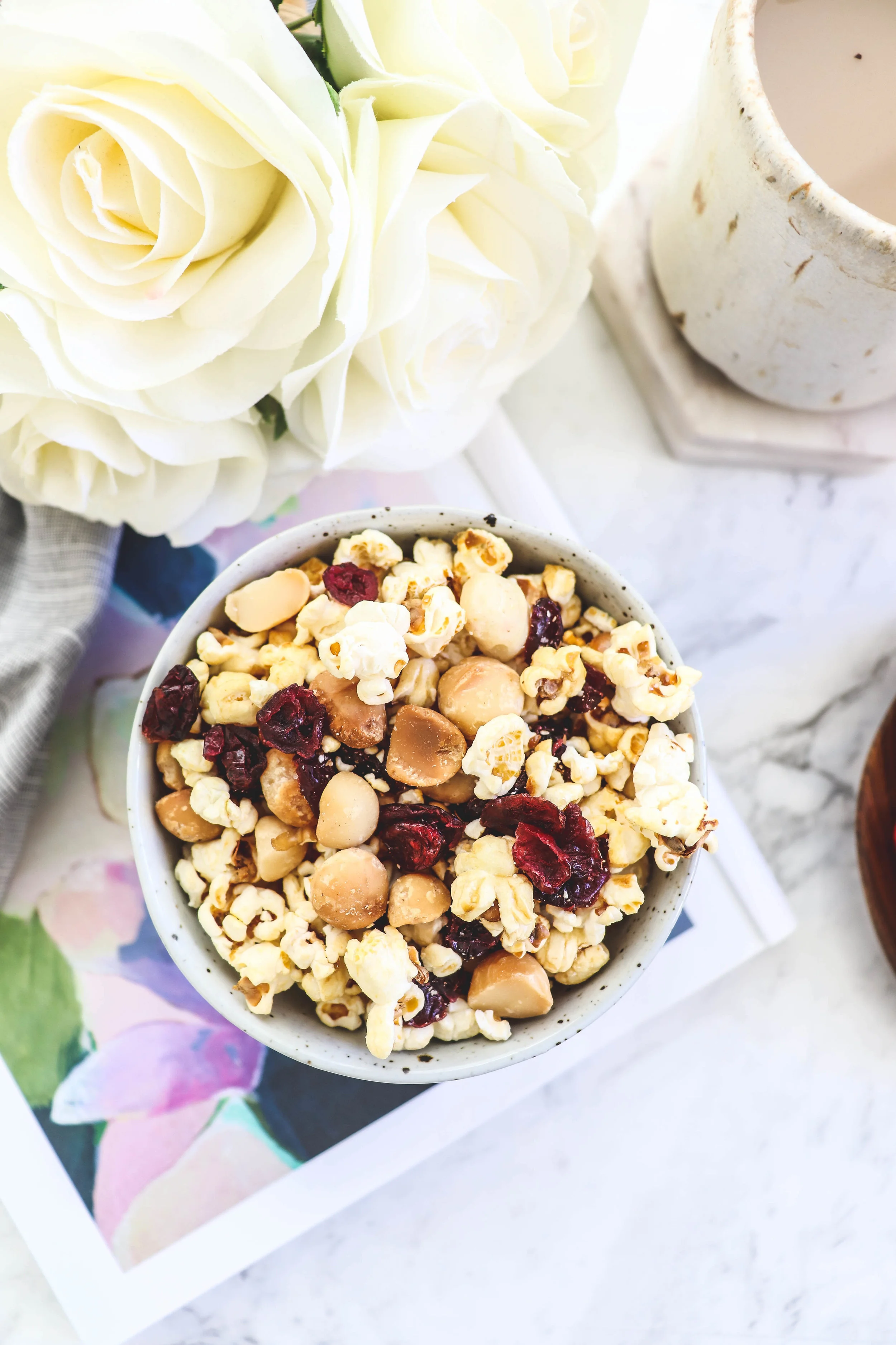 Roast some macadamias up and toss them through air popped popcorn and cranberries. The combo of different textures makes a great trio.