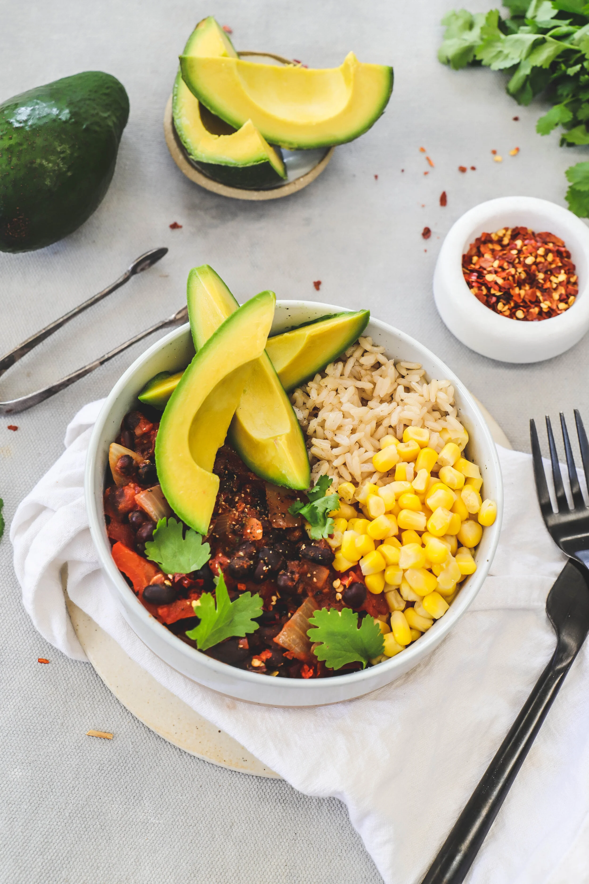 Serve bean mixture with cooked cook corn, brown rice, and avocado chunks. Top with extra chili or coriander, if desired.